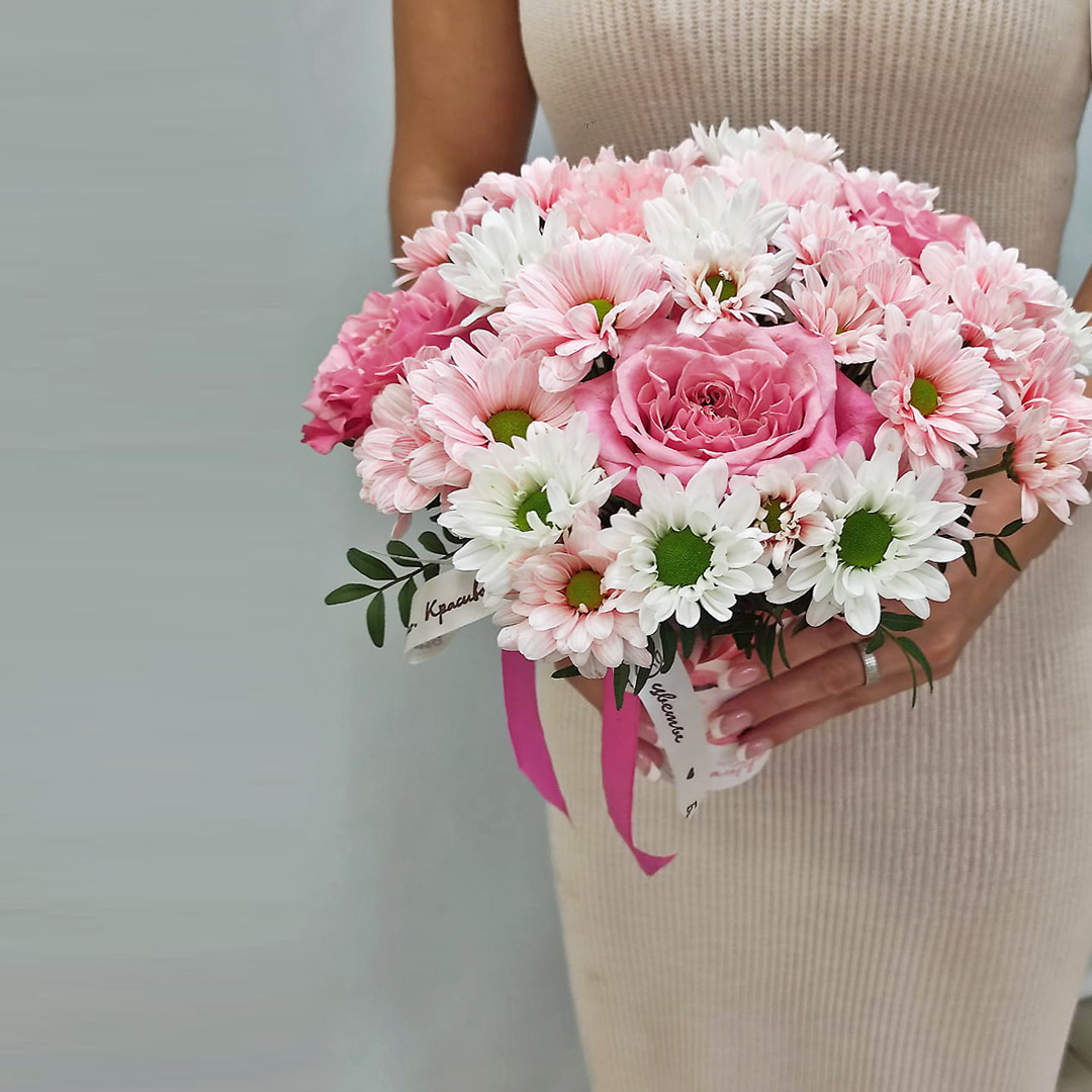 • Коробка с цветами "Ласковые мечты" из кустовой и Эквадорской розы, орхидеи и гербер арт. 27796